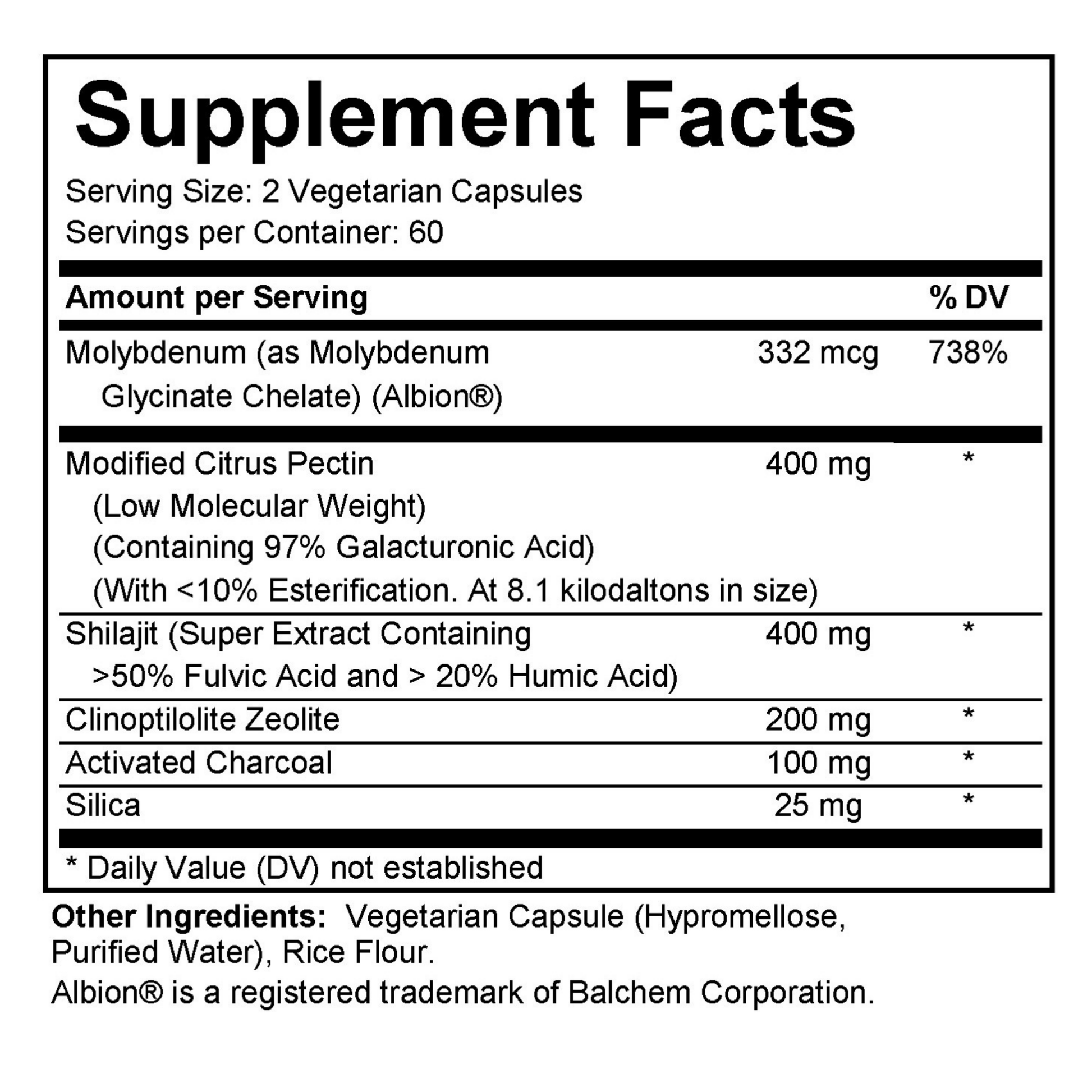 - Features Molybdenum, Modified Citrus Pectin, Fulvic/Humic Acids, Zeolite, Activated Charcoal, and Silica*
