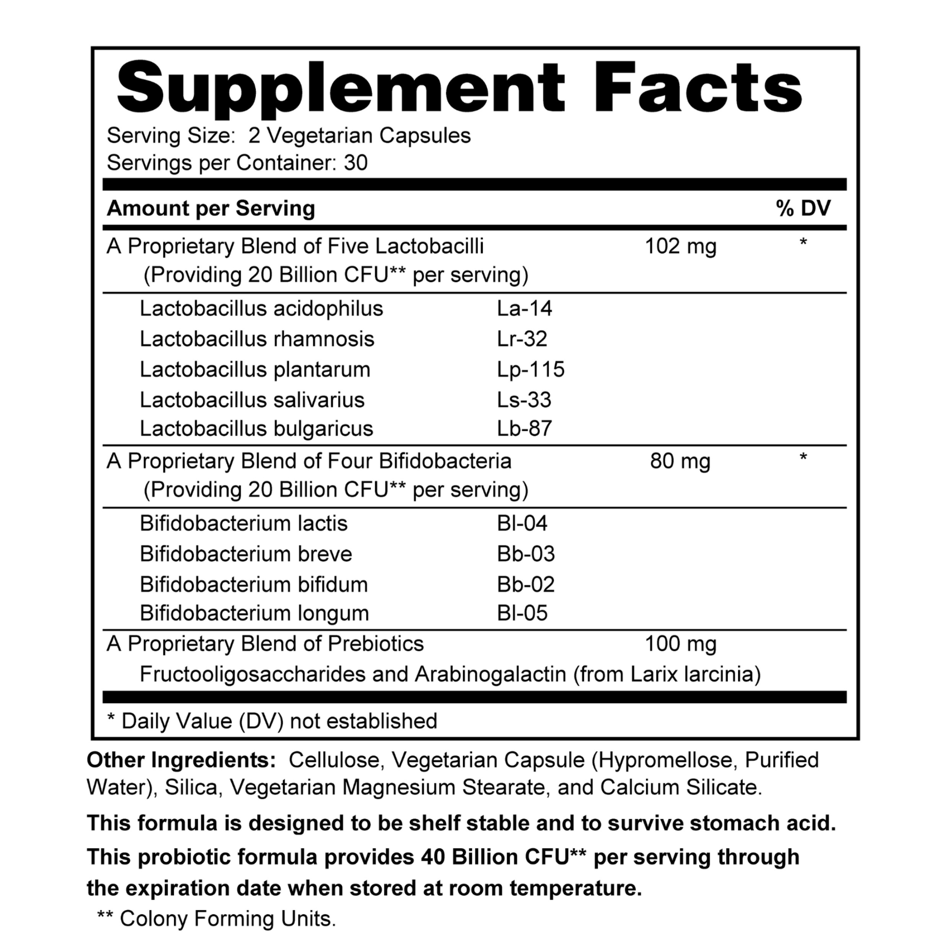 - High-potency probiotic delivering 40 Billion CFU per serving*
