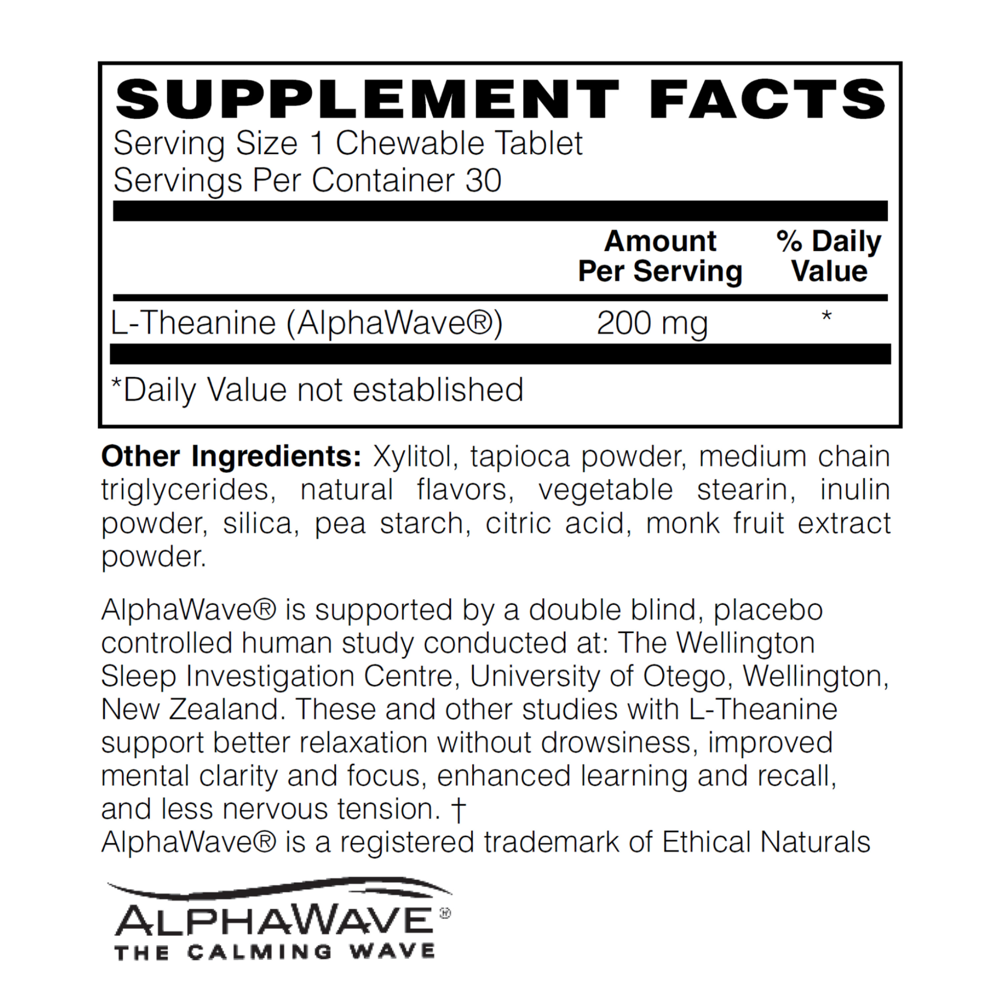- Clinically studied AlphaWave® L-Theanine — 200 mg per chewable tablet*